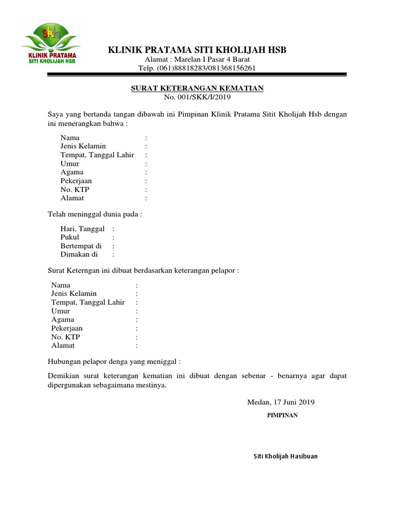 Contoh Surat Keterangan Kematian : 10 Contoh Surat Kematian Dari Rumah Sakit Puskesmas Kelurahan Dan Lain Lain Berbagai Keperluan Materismk Materi Pelajaran Anak Smk : Surat keterangan kematian biasa digunakan untuk mempermudah atau melengkapi persyaratan tertentu.. Siapkan fotokopi kk dan ktp semua ahli waris; Islam telah meninggal dunia : Surat keterangan kematian tidak kalah pentingnya dari akte kelahiran, selain sebagai untuk pengurusan administrasi, tetap juga sebagai alat pemerintahan untuk mendata jumlah kematian. Contoh surat kematian ~ bila seseorang telah meninggal dunia diperlukan surat keterangan kematian yang dikeluarkan oleh kelurahan setempat atau pejabat setingkat lurah untuk berbagai keperluan yang terkait, misalnya saja urusan pengalihan harta warisan, penguasaan sesuatu hal. Untuk membuat rekening bank dibutuhkan data informasi pribadi yang dibuktikan dengan identitas.